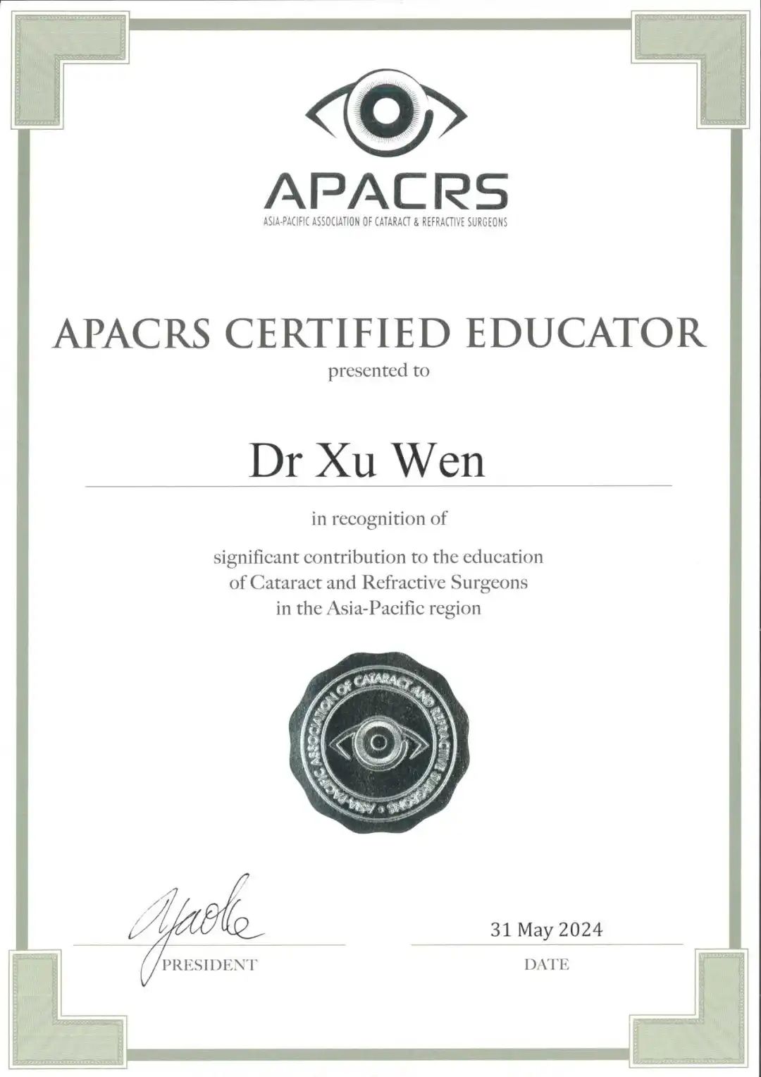 信息速遞 在前不久落幕的第36屆亞太白內(nèi)障及屈光手術(shù)醫(yī)師學(xué)會年會上,徐雯教授榮獲APACRS“認(rèn)證教育者”稱號,以表彰她在亞太地區(qū)推動先進(jìn)技術(shù)傳播,提高醫(yī)療服務(wù)公平性、可及性等工作上取得的杰出成就。