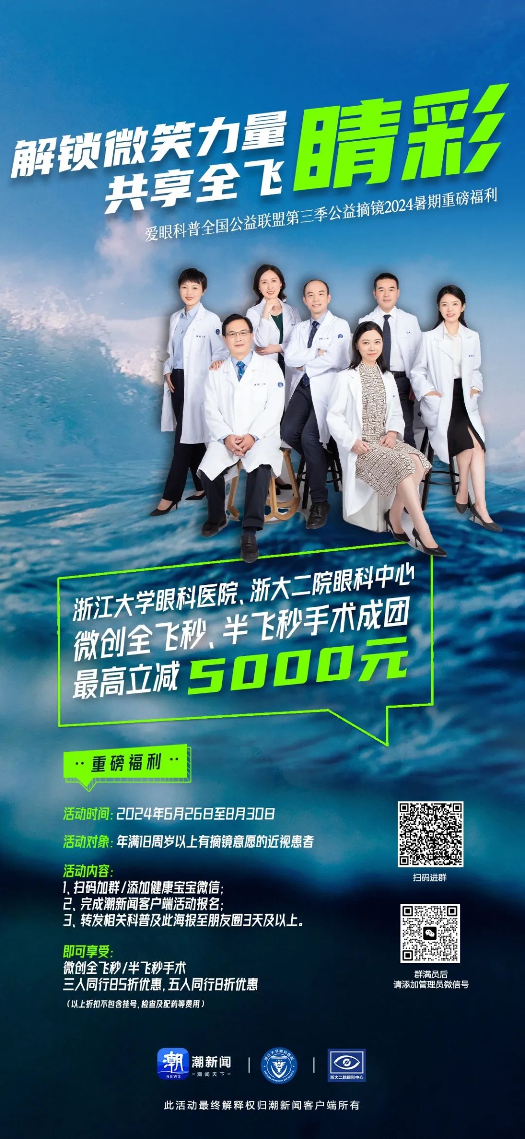 即日起,凡在潮新聞客戶端報名,約上三五好友前往浙江大學眼科醫(yī)院(浙大二院眼科中心)屈光手術中心做微創(chuàng)全飛秒/半飛秒近視激光手術,即可享受8~8.5折不等優(yōu)惠,最高可省5000元!